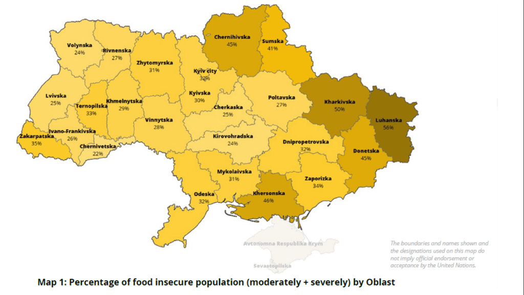 However, it is exceedingly obvious that it is Ukrainians themselves who bear the brunt of the war, with 7.1 million people displaced, millions forcibly deported to Russia, at least thousands killed, with those who remained behind facing food insecurity. A May 2022 survey of 4,700 Ukrainians conducted by the World Food Programme found that one-third of households were food insecure and had to forgo meals, decrease portion sizes, and eat lesser quality foods. In the highly affected eastern and southern oblasts, with about half of households being food insecure (see map below). Worst of all were internally displaced people in the east, with a rate of 62% (including 14% being severely insecure).